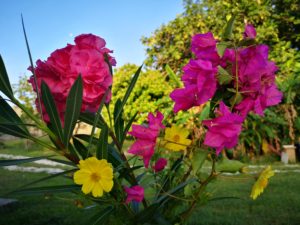 Abia m-am trezit si l-am vazut cum imi pregateste minunatul buchet si o vaza grozava din jumate de sticla de 2L de ,,Borsec,,. Trebuie sa te adaptezi aici :P. M-am bucurat atat de mult pentru buchetul facut cu dragoste :D, florile miroseau minunat, dar pe dupa masa s-au si ofilit. Ori nu le-a placut apa cu clor de la chiuveta, ca deh, asta de Caraibe sunt mai pretentioase si le trebuie apa de mare cu pink hylamaya salt, apa Evian si un pic de Chanel sau poate ca pur si simplu a fost prea cald si pentru ele. 😀
