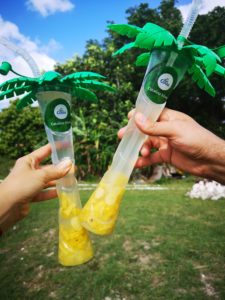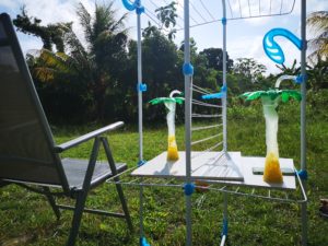 A doua zi a continuat cheful :P. A pus uscatorul de rufe in gradina, peste a pus o placa de gresie si a facut o masuta de cafea. Apoi a facut 2 cocktail-uri din apa, lamaie, ananas si ghimbir. Nu pentru ca eram mahmuri, nu va ganditi la asta!!! 🙂 Ci pentru a lucra la imunitatea noastra in vremurile astea grele. Asa ca am stat amandoi la soare, cu paharele in mana si am ciocnit. Paharele sunt luate de pe croaziera (urmeaza si povestea asta) si sunt tare fancy. 😀